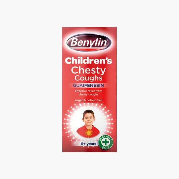Benylin Children Chesty Cough 150 mL is a non-drowsy syrup with guaifenesin 50 mg and levomenthol 1.1 mg per 5 mL to thin mucus and soothe airways.