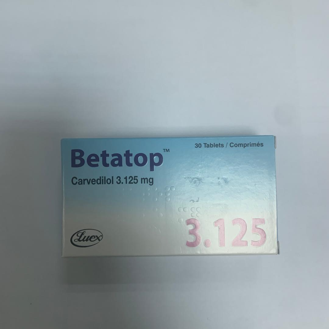 Betatop 3.125 mg tablet contains carvedilol, a medication used to treat high blood pressure, heart failure, and to improve survival after a heart attack. It works by relaxing blood vessels and slowing heart rate to improve blood flow and decrease the heart’s workload.