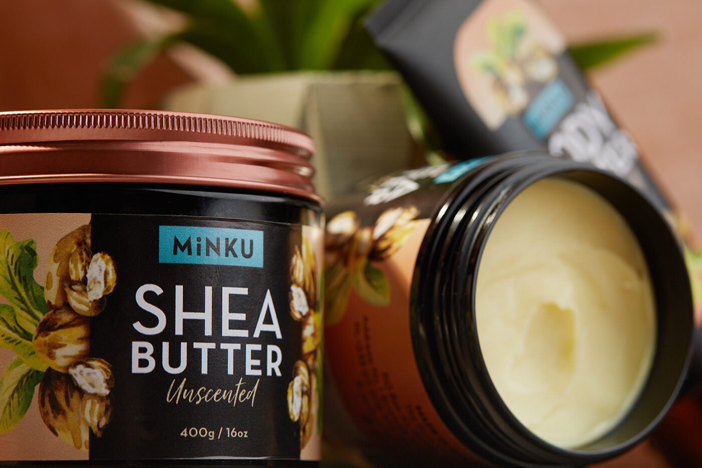 Minku Shea Butter is a 100% natural, cold-pressed moisturizer from Ghana, available in Unscented, Tropical, and Savannah Groove variants. Rich in vitamins A and E, it deeply nourishes skin and hair while soothing dryness and irritation. It comes in 100g,200g and 400g jars, ideal for daily skin and hair care.