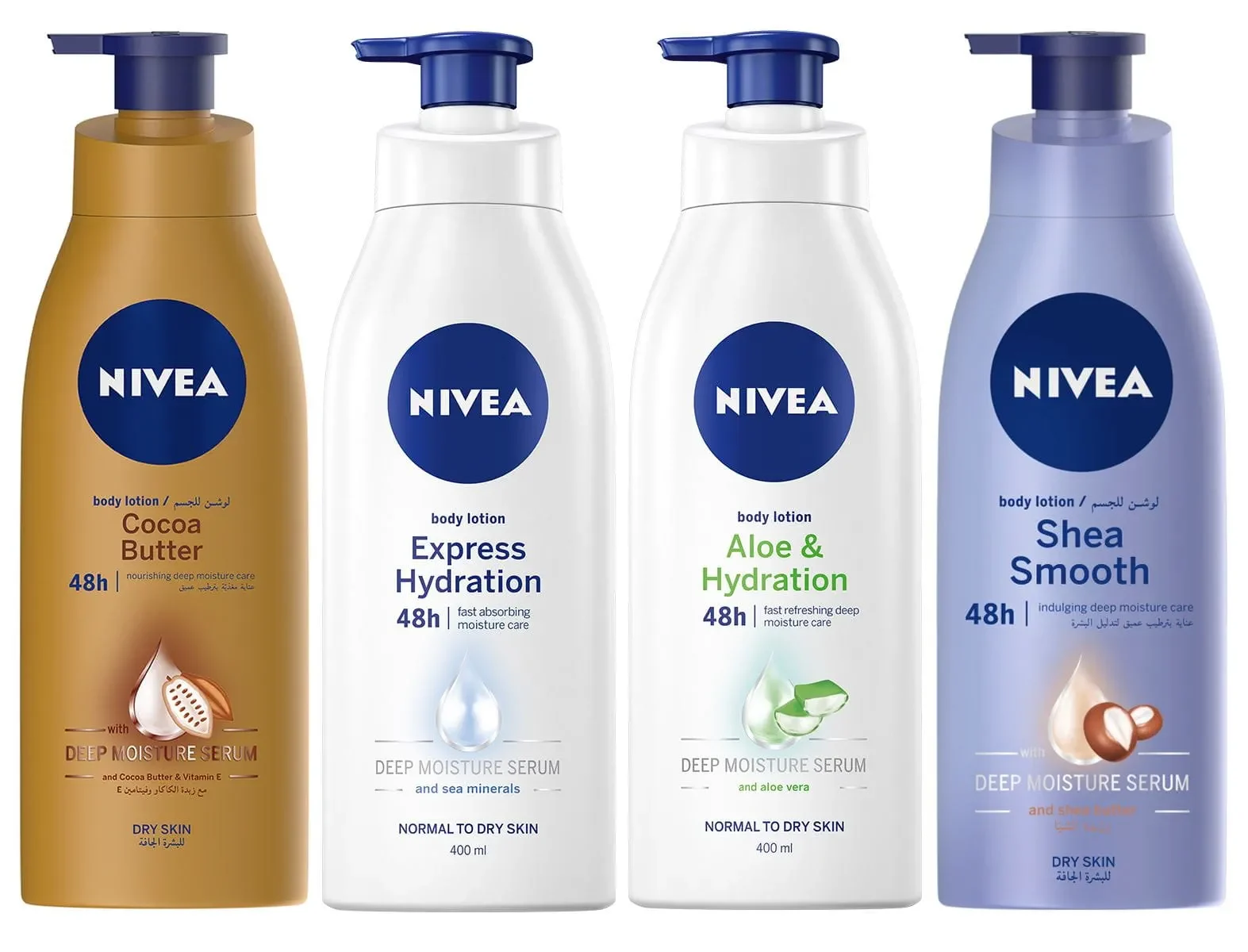 | Key Ingredients | Glycerin, NIVEA Deep Moisture Serum; may include Aloe Vera, Cocoa Butter, Vitamin E, Almond Oil, or Coenzyme Q10 |